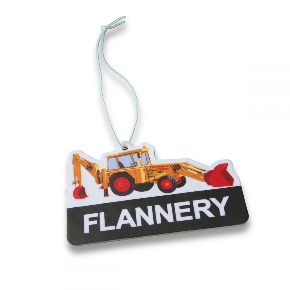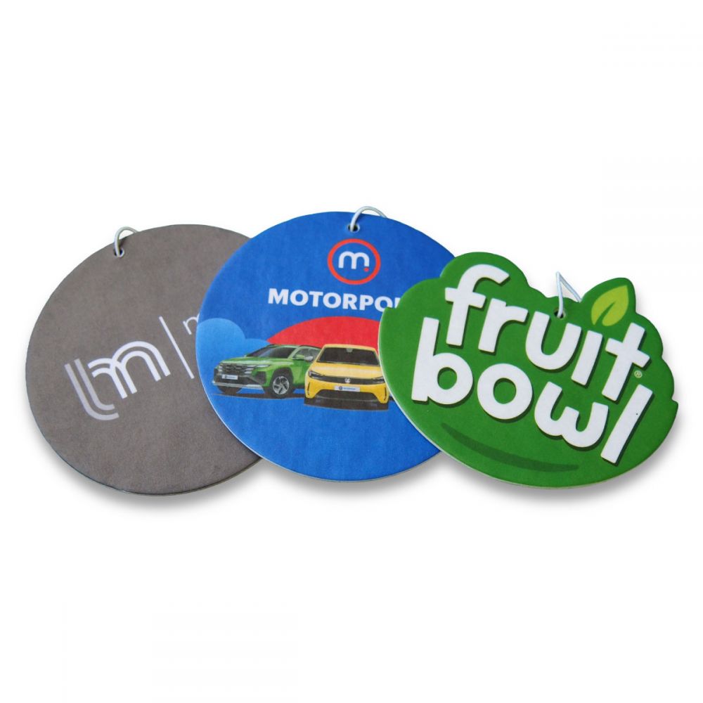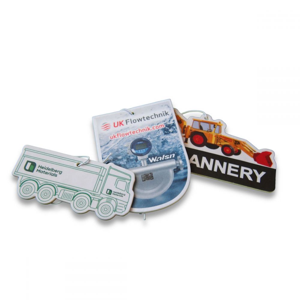 A fully bespoke air freshener made from an absorbent paper board printed up to full colour on both sides. Perfect for promoting companies or brands while keeping vehicles smelling sweet. Air fresheners are particularly suitable for automobile-related businesses ranging from garages and dealerships to companies offering auto insurance or valeting and detailing services.